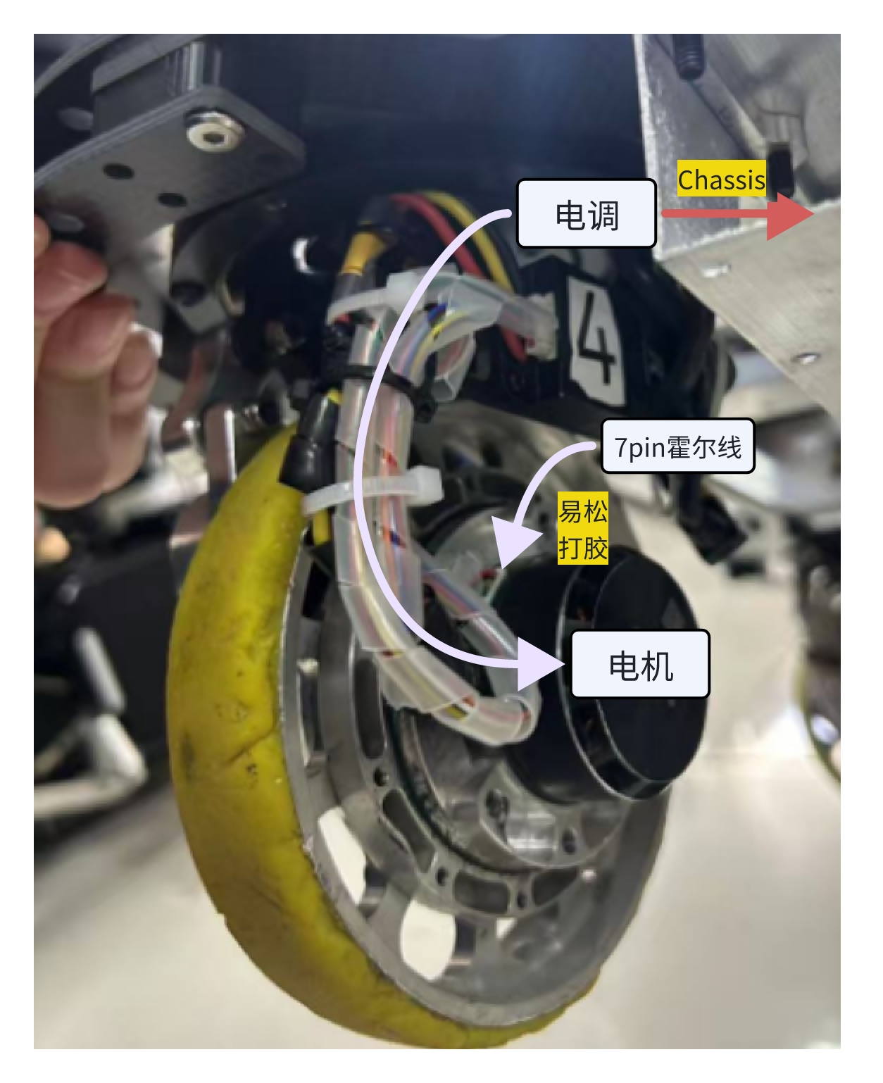 上图是一个轮组,由于悬挂的存在,电机和电调之间会存在【⚠相对运动】,所以要预留一部分长度,并保障悬挂和舵轮都不会被扯到线。