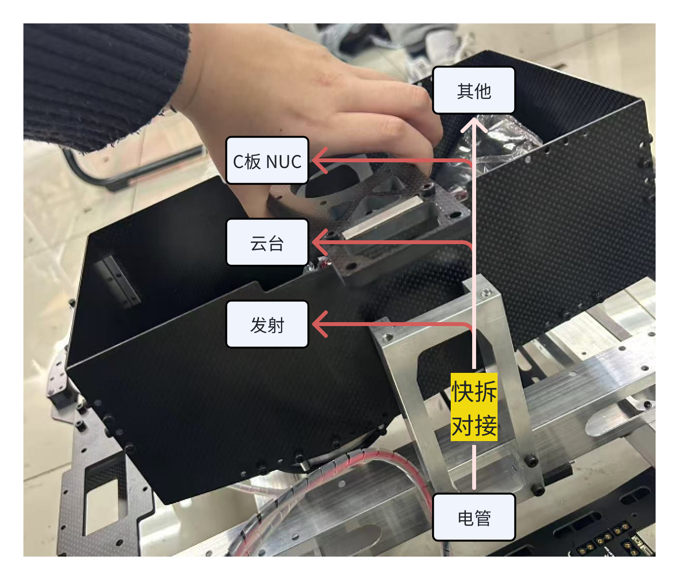 上图是快拆云台的示意图。为了实现快拆,各种线材也应该有易于断开的接口。上下预留的长度都要合理,线材应集中起来包起来。如图所示的下压对接时也要注意⚠拨盘等其他部件是否会压到底盘线材。